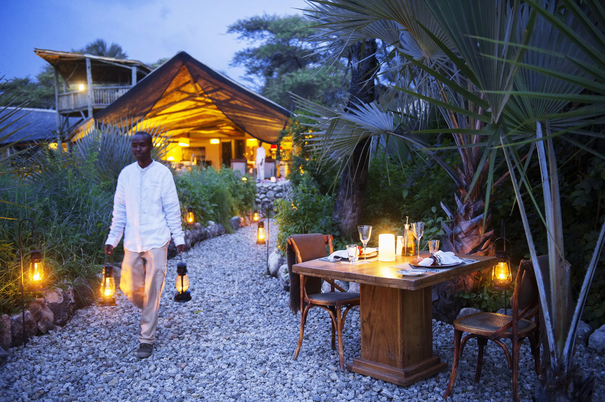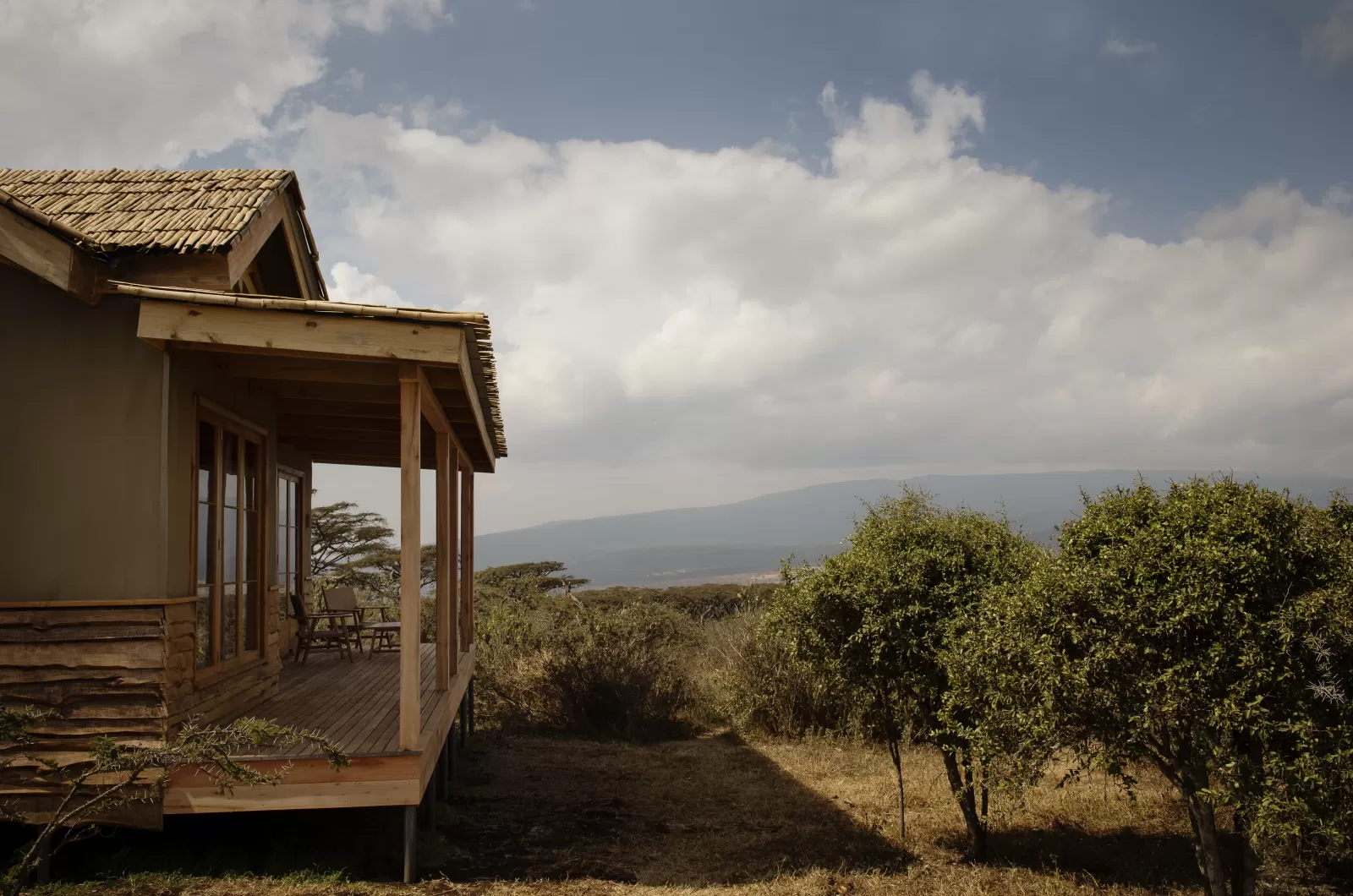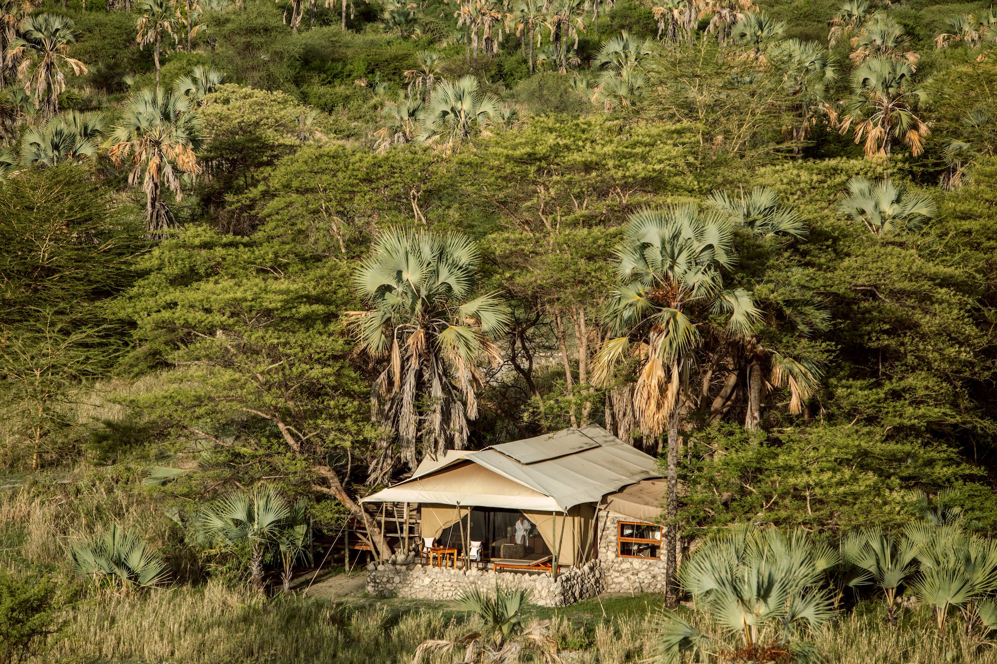 The main lodge and its exclusive-use villas combine earthy elegance with contemporary comfort — spacious suites adorned with natural linens, warm wood tones, and open decks overlooking the flamingo-dotted shores of Lake Manyara.